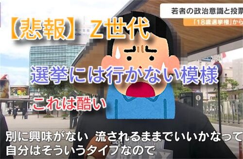 【呆れ】Z世代「選挙興味ないです」に対する皆の反応 選挙に行かないのなら、この後理不尽なことあっても文句言うなよ。 私は勿論行きます。 最近は増税や移民問題(埼玉クルド人など)、ポリコレなどのせいで生きづらい世の中になっている。氷河期世代も見…